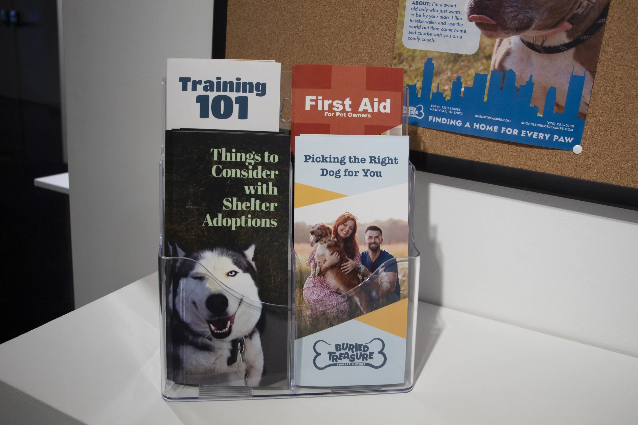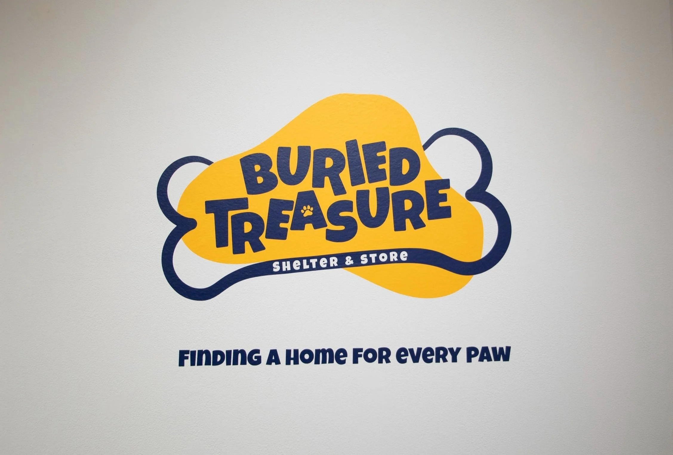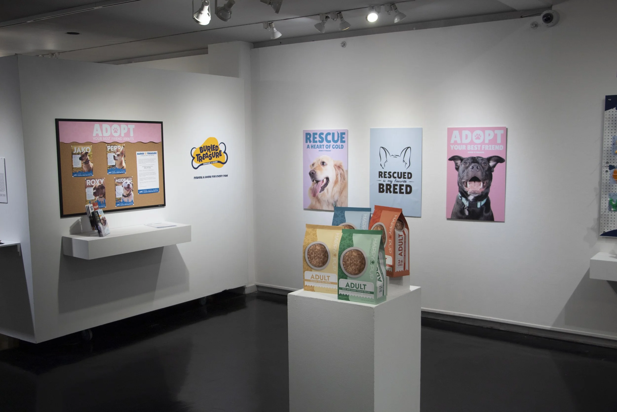 Buried Treasure is an animal shelter with an attached store that has everything a new dog owner might need to make their new animal comfortable in their new home. The shelter includes adoption posters, informational brochures, adoption paperwork, and social media posts. The store includes typographical posters, photographs, a pegboard with toys and necessities, dog food, treats, and shampoo. All of the designs are made to be friendly and welcoming, something that either a new and experienced dog owners alike would want to pick up for their new pup.
